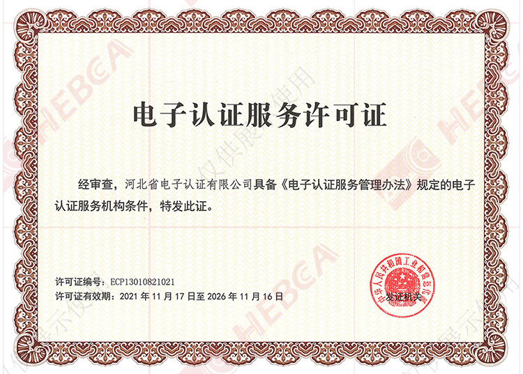 2016年11月河北省電子認(rèn)證有限公司取得國家工業(yè)和信息化部換發(fā)的《電子認(rèn)證服務(wù)許可證》。